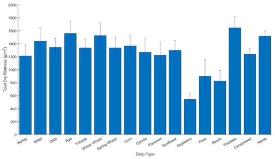 Averaged AGB by crop type in 2016 derived for the SMAPVEX16-MB study area. Beans and peas are characterized by lower AGB values.