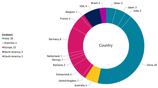Secondly, with thorough study, the papers that adapted object-based methods, traditional machine learning methods, performed vehicle segmentation and the studies that used terrestrial scene images, multi-view stereo (MVS) and Lidar for data collection were filtered out. Also, the technical reports that were not peer-reviewed papers were filtered out to select 71 papers that studied semantic segmentation of VHR satellite images for urban feature classification using DL-based methods. The 71 papers come from different countries. The countries of the first author’s affiliation are shown in Figure 1.