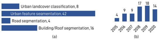 The 71 papers can be divided into 4 study targets as building/roof segmentation, road segmentation, urban feature segmentation and urban land cover classification. Some papers intend multiple targets. The distribution is shown in Figure 2, which shows fewer studies on urban land cover [96,100,134,136,137,138,139]. With the availability of VHR images, smaller urban features have been segmented in the majority of papers. The papers that used dataset such as ISPRS Vaihingen 2D Semantic Labeling dataset, ISPRS Potsdam 2D Semantic Labeling dataset and IEEE GRSS (Geoscience and Remote Sensing Society) Data Fusion Contest (of Zeebrugge, Belgium) are dedicated to the improvement of semantic segmentation of urban features from traditionally interesting “urban area” class to Impervious surfaces, Building, Low vegetation, Tree, Car, Water, Boats and Clutter/background. Some have segmented urban features as small as sidewalk, motorcycles, traffic signs, pedestrians, picnic table, orange pad, buoy, rocks, sports courts, etc. [106,121,140,141]. Some classified buildings to their utilities [102,113], smaller features inside roads [142] and slum area [135]. Besides the segmentation of features, the studies use different approaches to improve semantic segmentation of urban features, which are shown in Table 1. The coherent regions used for segmentation are pixel, patch and super-pixel for 66, 4 and 2 papers respectively, including [143], which uses super-pixels to enhance pixel-based segmentation.