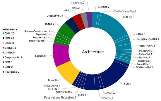 Overview of the deep learning (DL) architectures employed. The encoder-decoder models like Fully Convolutional Network (FCN), U-Net, SegNet, DeepLab, Hourglass and others are the most commonly employed ones. Many papers have employed more than one of these architectures to later fuse the output feature maps.