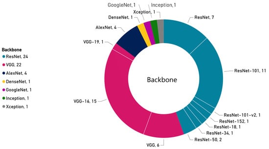 Overview of the convolutional backbones employed. Out of the papers that mentioned the use of backbones, the most commonly employed are ResNet and Visual Geometry Group (VGG). As many papers used multiple DL architectures, more than one backbone is used by those papers.