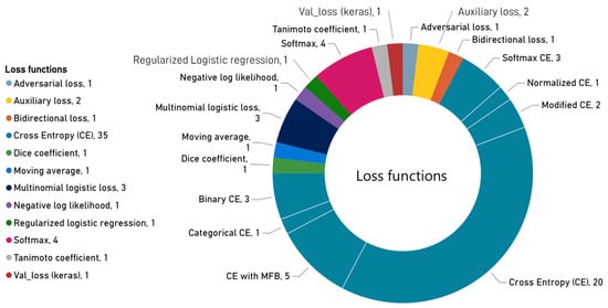 The loss functions that are used to evaluate how well specific algorithm models the given data include commonly used cross-entropy (CE) loss function (35 papers). The variety of CE loss used includes binary CE with semantic encoding loss [154], CE with median frequency balancing (MFB) [61,94,109,110,162], normalized CE [151], categorical CE function called logloss [125] and sparse softmax CE [135,148]. Some modified the CE loss [142,163] and compared the use of CE with MFB and CE with focal loss function weighted by MFB [110]. Other loss functions include auxiliary loss [62,89], adversarial loss [127], regularized logistic regression [144], multinomial logistic loss [146,147,161], validation loss from Keras [121], softmax [104,106,134,138], bidirectional loss [76], moving average [169], negative log likelihood loss (NLLLoss) [164] and Dice coefficient and Tanimoto coefficient [108]. The distribution of loss function is shown in Figure 8.