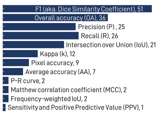 A wide range of metrics are used to evaluate the methods/models as seen in Figure 10 For simplicity, we refer to “DL performance” as the DL model’s performance score obtained from the metrics used in the papers. Most papers use multiple metrics to compare different combinations of same the model or to compare to other base models. The use of different experimental dataset and performance metrics makes performance comparison between different papers extremely difficult and often carries conviction. Therefore, we summarize the findings in the most meaningful ways by only comparing overall accuracy (OA) and F1 score among the papers that segmented multiple classes, and do not compare other metrics if these already exist OA. And some used k-fold cross validation in case the train and test dataset was small [135,137,146].