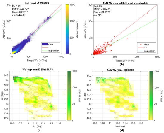 As an example, the results obtained for the date 2008-09-09 are shown in Figure 8. The figure shows: (a) the test result based on the 99% of the data not involved in the training, represented as density plot of ANN estimated vs. target WV, (b) the ANN validation on the NFI dataset, (c) the GLAS WV map considered as target, (d) the WV map generated by the ANN, and (e) the absolute error map.