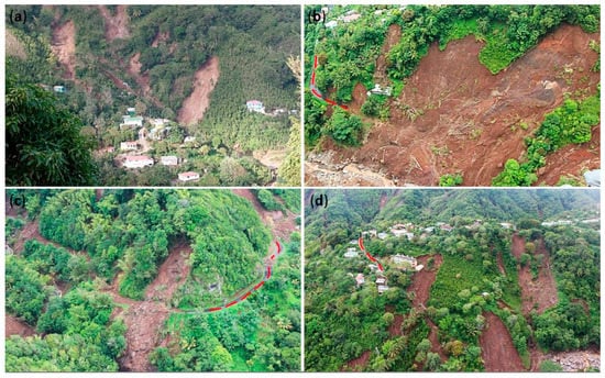 Landslides triggered from Tropical Storm Erika in the village of Petite Savanne. (a) is from [12], while (b–d) are from [13]. The roads have been highlighted with red-dashed lines to illustrate the impact on the transportation infrastructure.