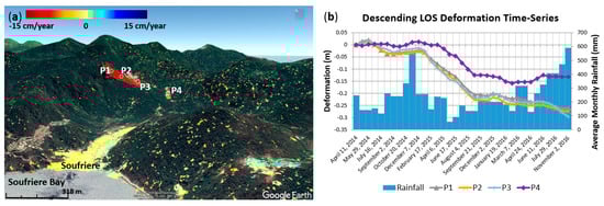 When creating a landslide inventory map, it is important to know when the landslides occurred. This is carried out to properly link the landslides with their triggering event in order to better predict future landslide risk from similar events. For slow-moving landslides, InSAR time-series analysis can be used to narrow down the time-period of when the slope initially begins to fail. When integrated with rainfall data (or landslide triggering events), the connection between the initiation of deformation and rainfall (or triggering event) may be analyzed. From the time-series analysis and rainfall data illustrated in Figure 4b, for example, the time-period for when the deformation was initiated for all points was observed to be between the December 2014 and January 2015 acquisitions. This deformation was shown to be initiated shortly after a significantly rainy month (November) in 2014. From this data, it is therefore suggested that the landslide observed at points P1–P3 was initiated between the end of 2014 and the start of 2015, and that heavy rainfall from the month of November 2014 may be the triggering event. Additional information regarding the variability in deformation behavior between the four points is also illustrated in Figure 4b. All points, for example, are shown to be relatively stable throughout the 2014 acquisitions. After the possible triggering event, each point shows subsidence, with P1–P3 subsiding at a faster rate than P4. P4 is then shown to be relatively stable throughout 2016, while P1–P3 continuously subside at different rates. This type of information provides a better understanding of the slope behaviour before and after the initiation of subsidence. Ref. [57] have shown similar motion on different parts of the island.
