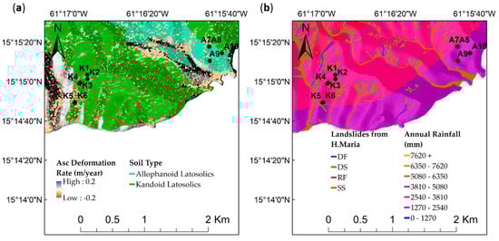 InSAR motion maps with time-series analysis can be used to facilitate a deeper understanding of the state of the slope prior to failure. Understanding pre-landslide conditions is essential as they are used to establish indicators for future risk when producing landslide susceptibility maps. Typical indicators that are used include slope, soil type and thickness, elevation, and annual rainfall amount. With InSAR, an additional indicator, such as slope motion behaviour observed prior to the initiation of slope failure, could be used. These behaviours may include whether or not the slope was stable, subsiding, or demonstrating uplift, and at what rates and time of year there was motion. This information can then be integrated with other parameters for a more robust understanding of pre-landslide conditions. An example of this is illustrated through Figure 5, which shows the results of applying the SBAS technique to ascending DIs from February to September 2017 over the southeastern area of the island. This dataset comprises the six months of acquisitions prior to Hurricane Maria. Figure 5a is a subset of the ascending LOS annual deformation-rate map overlaying the main soil types. Figure 5b is the mapped landslides triggered by Hurricane Maria overlaying the annual rainfall within the same area. Both images are overlaying a shaded relief. Within both images are ten points selected for time-series analysis. Points K1 to K6 are within the kandoid latosolic clays, and points A7 to A10 are in the allophanoid latosolics. All points are from areas that experienced debris slides (DS) from Hurricane Maria.