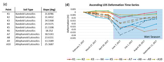 From the time-series in Figure 5d, the different deformation behaviour of each point prior to failure is observed. Points K1–K4 are shown to be stable until the start of the wet season. The other points show a slow rate of subsidence prior to the wet season, after which their rates of subsidence accelerate. All the points either remain stable after the June acquisition, or begin to demonstrate uplift. Through linking these site-specific patterns to other indicators used in future landslide risk assessment, such as slope and soil type, a more detailed analysis of the pre-landslide state may be established. For example, based on soil type, the kandoid clays and allophane latosolics are shown to be displaying similar trends, with the allophane latosolics showing an overall greater magnitude of deformation. With the addition of the slope information, it appears that the clay soils showing the greatest deformation are also the areas with the shallower slopes. This is observed within both the allophane latosolics and kandoid clay soils. For the allophane latosolics, point A9 has the shallowest slope (~13 degrees) and the greatest deformation (up to 4 cm in subsidence before showing uplift). Within the kandoid clays, points K5 and K6 have the shallowest slopes (18 to 21 degrees) while also demonstrating the greatest deformation (subsidence over 2.5 cm).