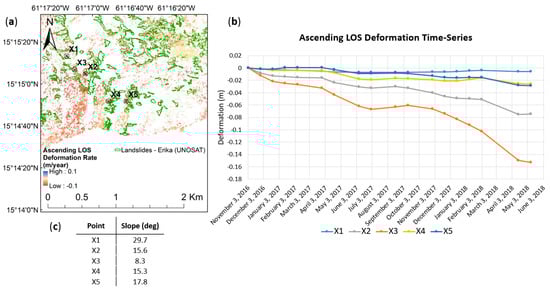 When making the inventory map, the landslides recorded from each mapping session are added together and used in part to create the susceptibility map. The inventory map overlaying the susceptibility map in Figure 4c, for example, is generated based on the landslides recorded from inventories conducted in 1987, 1990, 2007, 2014, and 2015. Using InSAR, the activity levels of these landslides may be monitored. This information can assist in the classification of these landslides as being either active or dormant. Knowing which areas are active can facilitate a more targeted approach for the implementation of landslide mitigation strategies, as well as be used as additional indicators in the production of the susceptibility map. Figure 6 is shown as an example of using InSAR for post-landslide monitoring. Illustrated in the figure are the results of applying the SBAS technique to the ascending DIs ranging from November 2016 to May 2018. This set of data represents roughly a year and a half post-Tropical Storm Erika (and pre-Hurricane Maria). The InSAR results are integrated with the recorded Tropical Storm Erika-induced landslides. The five points selected within these landslides (points X1–X5) are highlighted in the figure. Figure 6b,c shows the slope values and time-series analysis of each point.
