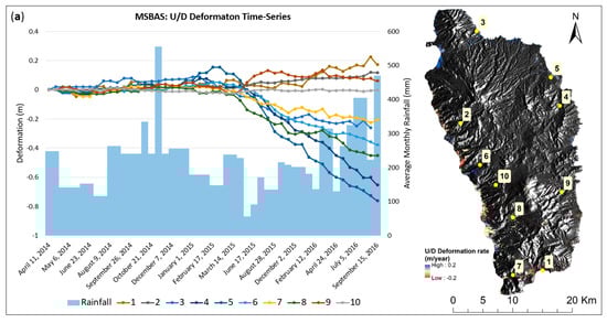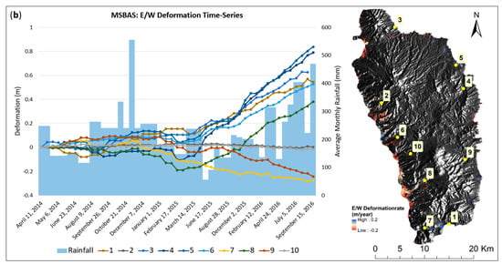 Figure 7 shows the MSBAS results over the island using ascending and descending data acquired between April 2014 and September 2016. Figure 7a is the deformation-rate map of the component of motion in the U/D direction, alongside the corresponding time-series of the ten points highlighted. Figure 7b is the corresponding data for the component of motion in the E/W direction. The blue colours represent up and east, while the red colours represent down and west. Illustrated in the time-series of the figure are the differential deformation rates and two-dimensional direction of motion of the ten points highlighted. From this data, it can be shown that point 1 is mostly moving east at a relatively slow rate, while point 9 is mainly moving west at a faster rate. Some locations are showing a relatively even mixture of moving down as well as east (points 4 and 5, for example), at relatively fast rates in both directions. Points 2 and 10 are shown to be relatively stable in both directions. These types of details can be utilized for a better understanding of the kinematic behaviour of the terrain, which would facilitate a more effective implementation of targeted landslide mitigation strategies. Due to the ruggedness of the island, however, the spatial extent of the MSBAS data is limited in comparison to the SBAS results (as discussed at the beginning of Section 4). As the MSBAS data provides highly beneficial information, using different viewing geometries may improve their use for high relief terrain, as occurs at Dominica.