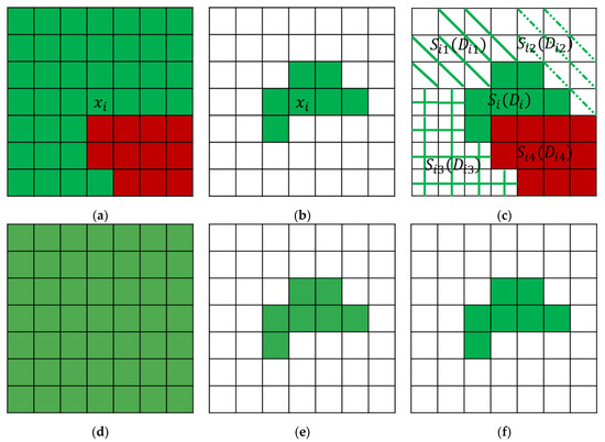 We proposed the WASCK method to classify the HSI by utilizing the spectral-spatial features. The spatial neighborhood used in CK is constructed in a square region centered on each target pixel, which makes the objects be affected by backgrounds. In order to reduce this effect, the SCK method uses the information of superpixels to find the homogeneous region. Furthermore, we use adjacent superpixels information and its location information of each superpixel to construct a weighted ASs. The weighted ASs strategy can reduce the impact of undesired superpixels by assigning different weights to adjacent superpixels. Figure 1 shows a simple example of different spatial region selection strategies. It can be seen that there are two different ground object targets, denoted as green and red respectively. Figure 1a–c show the strategies of the square neighborhood, superpixel neighborhood and weighted ASs neighborhood, respectively. Figure 1d–f show the corresponding features extracted under three strategies. Since the size of square neighborhood is artificially chosen and fixed, for a target pixel , if the size is too large, it will contain irrelevant pixels (i.e., red pixel). On the contrary, if the size is too small, more effective spatial information cannot be considered. It is difficult to find a suitable size for all target pixels, so the spatial features cannot be fully extracted to the classification (see Figure 1d). Figure 1b is the superpixel-based strategy. The size and shape of each superpixel can be adapted to vary based on different spatial structures. However, this strategy may cause the problem that each superpixel is too small to obtain effective spatial information on account of over-segmentation (see Figure 1e). Figure 1c is the weighted ASs-based strategy, where are superpixels adjacent to the target superpixel and are the corresponding centroids. By assigning smaller weights to dissimilar superpixels (i.e., ), this strategy can maintain ASs-based homogeneous regions to a large extent, and effectively reduce the adverse effects of dissimilar superpixels. The color of feature also demonstrates that the weighted ASs neighborhood will produce the most accurate result (see Figure 1f). Therefore, the weighted ASs strategy can effectively exploit spatial-spectral features of ASs.