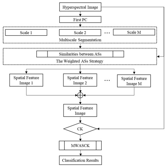 where can be selected empirically and represents the number of total scales. can be acquired by the spatial kernel of Equation (11) directly and represents spatial kernel on scale . As in the above case, we can obtain the decision formula by substituting Equation (12) into Equation (3). Figure 2 shows the flowchart of using weighted ASs features to classify HSI via MWASCK.