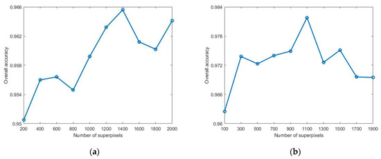 Figure 5 illustrates the line graph of the OA values of WASCK method under different number of superpixels (). The weighted ASs-based strategy requires smaller size of superpixels to form larger homogeneous regions. Hence, when is large, the WASCK has better classification performance. However, it will result in over-segmentation and cannot extract spatial information effectively when is too large, and then the classification performance will decline. As it can be observed, the optimal for two datasets is 1400 and 1100, respectively. It can also be found that when the optimal is exceeded, classification performance of the WASCK will degrade.