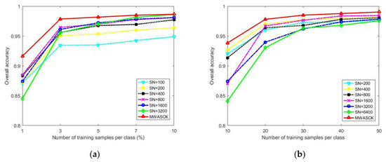 Figure 6 illustrates the OA values of single-scale and multi-scale MWASCK under different training samples. SN marked in the figure represents the number of superpixels. Obviously, with a limited training sample, single-scale MWASCK with fewer superpixels can obtain higher OA, while single-scale MWASCK with more superpixels can obtain higher OA with sufficient training samples. Therefore, it has been confirmed that spatial information cannot be effectively utilized by small scale superpixels with limited labeled samples. In addition, when a large number of superpixels are selected to achieve better experimental data, the spatial information of weighted ASs cannot be exploited effectively, resulting in poor classification performance (see SN = 3200 and SN = 6400 in Figure 6b). Meanwhile, when enough training samples are selected, the limitation of the segmentation algorithm will lead to the failure to improve the OA value. The proposed MWASCK method not only improves the OA values, but also avoids selecting the optimal and sufficient number of samples.