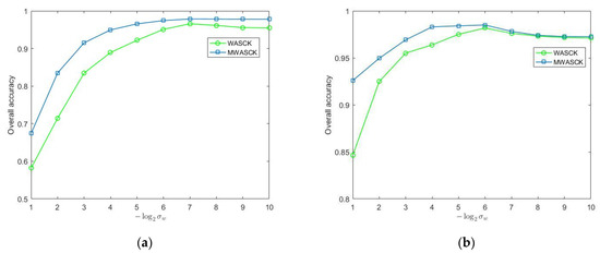 Figure 8 illustrates the effect of the kernel width on two datasets. We can observe that the MWASCK has a more robust kernel width value than WASCK. Meanwhile, the proposed WASCK and MWASCK can show better classification performance when goes from to on Indian Pines dataset and goes from to on University of Pavia dataset.
