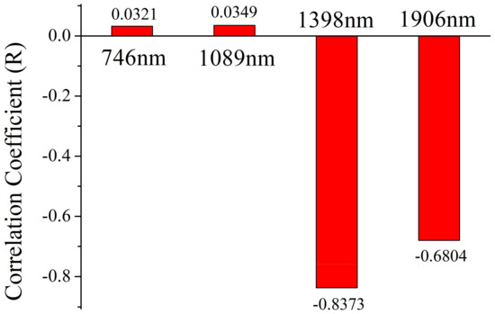 Figure 2 demonstrates that the region of EWT characteristic wavelengths was influenced by other biochemical parameters. Thus, the influence of other parameters needs to be eliminated to improve the accuracy of EWT monitoring. The characteristic wavelength at 746 nm is located at the range of the red-edge band, which belongs to a transition band. The reflectance spectrum at 746 nm was affected by Cab and LMA. However, the spectrum at 1089 nm was less affected by other pigments than the characteristic wavelength at 746 nm. Thus, the characteristic wavelength of N at 1089 nm was selected as a band for constructing nRVI.