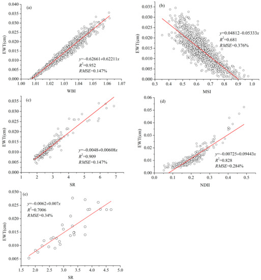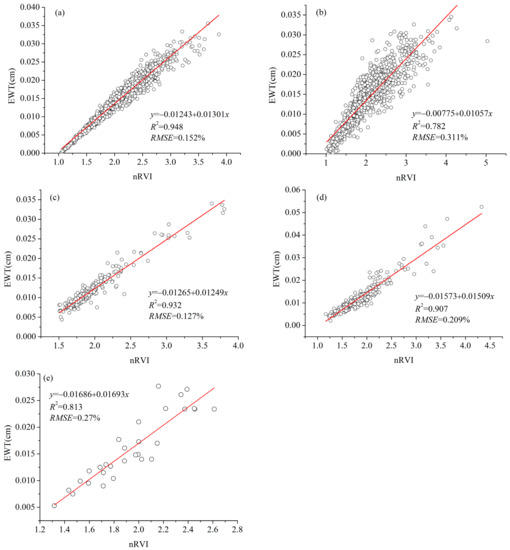 The correlations between the four selected published VIs and EWT for five corresponding datasets are provided in Figure 4. The correlations between the nRVI and EWT for all five datasets are shown in Figure 5.