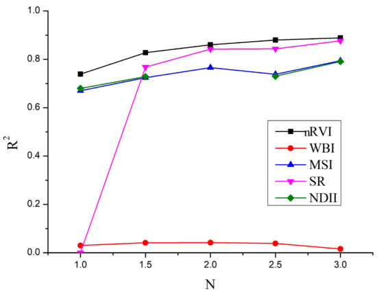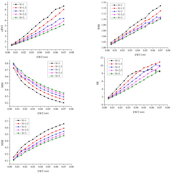 The influences of N on nRVI and the other VIs are shown in Figure 6. For the five VIs, the value of N affected the relationships between the VIs and EWT, especially at high EWT contents. Among them, the influences of N on SR were relatively large in the case of the lowest value of N (N = 1) and the high EWT values (0.045–0.07 cm). Compared to SR, the other VIs revealed less variability and more stability in the change of N.