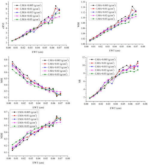 The influence of LMA on nRVI and the published VIs are shown in Figure 8. For nRVI, WBI, and SR, the effect of LMA content on the relationship between EWT and VIs was less than that of MSI and NDII, especially at low EWT values (0.005–0.035 cm). nRVI, SR, and WBI all showed lower variability and higher resistance to the changing LMA content at low EWT values (0.005–0.035 cm). For MSI and NDII, LMA (0.005–0.03 g/cm2) effects were greater throughout the range of EWT variation (0.005–0.07 cm).