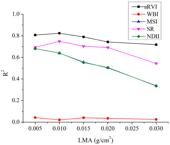 Figure 9 indicates the performance of the five VIs for EWT estimation across various LMA contents based on the synthetic dataset with 2% Gaussian noise. WBI still performed worst for the whole range of LMA values that are similar to N changes, according to Figure 7 and Figure 9, and the possible reason was the adding artificial noise in the synthetic dataset. The precision of MSI and NDII was also almost the same. When LMA = 0.005 g/cm2, the R2 of MSI, NDII, and SR were 0.6816, 0.6816, and 0.6932, while when LMA = 0.03 g/cm2, the R2 of MSI, NDII, and SR decreased to 0.3375, 0.3350, and 0.5439. This indicated that the accuracy of MSI, NDII, and SR for EWT estimation decreased obviously with the increase of LMA content. The nRVI still performed best no matter how the LMA content changed.