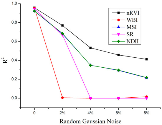 Figure 10 indicates the performance of nRVI, WBI, MSI, SR, and NDII for EWT estimation based on synthetic datasets with various random Gaussian noise. According to the results, all VIs performed the best accuracy without added noise. For the effects of adding noise, the higher the level of added noise, the greater the impact on VIs, but the five VIs were affected to varying degrees. WBI had no resistance to spectral noise regardless of the level of added noise, which was consistent with its performance in Figure 7 and Figure 9. The worst performance of WBI in Figure 7 and Figure 9 was due to the use of synthetic datasets with added artificial noise. SR had poor accuracy and great instability when the level of added noise was high (>2%). Therefore, the WBI and SR are maybe not appropriate indices for EWT estimation due to the sensitivity to the spectral noise. The accuracy of MSI and NDII for EWT estimation decreased sharply with the increase of noise level. However, nRVI had the best performance for EWT estimation in spectral noise resistance compared with the other VIs. Therefore, nRVI had the highest robustness to interference factors for EWT estimation.