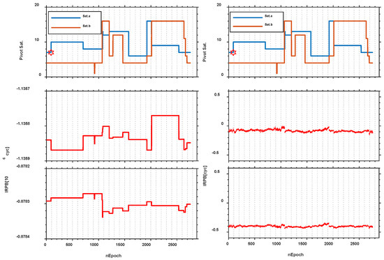 24 h-time series of estimation results with Septentrio PolaRx5 receivers. The panels from left to right are the inter-receiver phase bias (IRPB) before and after eliminating the jumps. The subplots from top to bottom correspond to pivot satellites visibility, IRPB at B1 and B2 frequency, respectively. The single differenced ambiguities belonged to Sat.a and Sat.b form the ambiguity Nab, which is coupled in the IRPB. As an example, the hexagram marker specifies the time to alter.