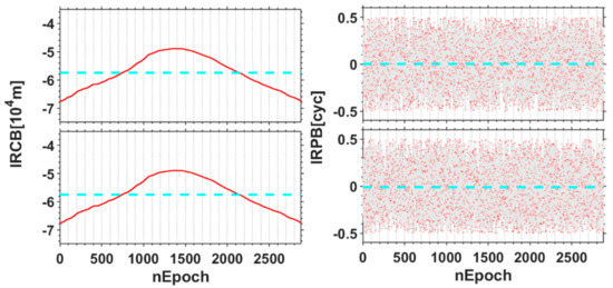 Figure 6 depicts that the IRCB at B1 and B2 frequency reach the order of magnitude of 105 m with slight fluctuation near the mean value. The standard deviations corresponding to B1 and B2 frequencies are 0.28 m and 0.22 m, respectively, which reflect the statistical stability of IRCB. In addition, it can also be seen from Figure 6 that the IRPB for B1 and B2 frequency is also relatively stable because the standard deviations reach 0.021 cycles and 0.015 cycles for B1 and B2, respectively, which has no influence on the ambiguity resolution. Therefore, with the common clock mode, the averaging IRB estimation results over multiple epochs can be used as the calibration for the ambiguity resolution.