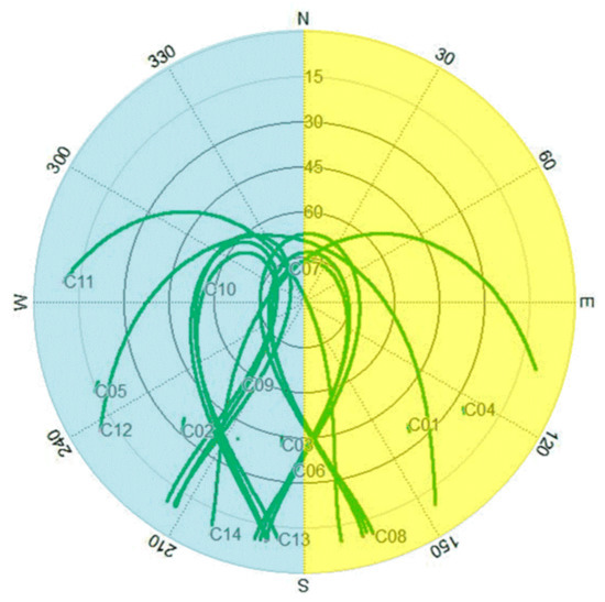 In order to evaluate the advantages of the proposed method over the traditional NC-RTK method in terms of positioning accuracy and integer ambiguity resolution, we simulate the obstructed satellite visibility cases. In this section, an experiment was conducted with three PolaRx5 on DOY158, in which two receivers, indicated as r1 and r2, were equipped with a common clock and a common antenna. Moreover, the third receiver as the reference receiver, denoted as b, has a 5 m baseline distance with the other two receivers. The sky plot of all tracked BDS satellites for r1 and r2 is given in Figure 8. In order to simulate the constrained environment, firstly, we manipulate the available satellites for r1 are corresponding to the azimuths ranging from 180° to 360°, the available satellites for r2 are from 0° to 180°. Therefore, the extreme case that there are no common-in-view satellites between rover can be created. Secondly, the elevation mask θ is adjusted from 10° to 30° for all the receivers with step of 5°. Thirdly, the azimuth mask α for r1 and r2 with the step of 10° is decreased to create less available satellites between rover receivers. The satellite constrained environment may also introduce multipath and sometimes other types of interference that are not considered in this contribution. We use the ambiguity dilution of precision (ADOP) and position dilution of precision (PDOP) to show the benefit of more observation redundancy from utilizing the proposed method [32]. The mean values of the estimated IRCB and IRPB sequences listed in Table 4 are used as a correction to calibrate the IRB for the second baseline configuration with a common clock. The empirical success rate Ps for ambiguity resolution is defined as the ratio between the correctly-fixed epochs and the total epochs.