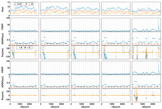 Figure 9 gives the positioning results, including the fixed solutions and float solutions. The statistical results are summarized in Table 5, including the root mean square (RMS) of 3D positioning errors and the success rate of ambiguity resolution. Note that Figure 9 only shows the worst case of all the experimental results, only a fraction of epochs was processed due to either the insufficient satellites for positioning or extremely poor satellite geometry (PDOP>30) under the BDS-only situation. Furthermore, it can be observed from Figure 9 that when the azimuth masks for r2 and r1 are up to (160°, 200°), the NC-RTK has more positioning interruptions due to the number of satellites are required at least five for the traditional RTK method. In contrast, the C-RTK method has better continuity performance because of the observation redundancy from IRB calibration.