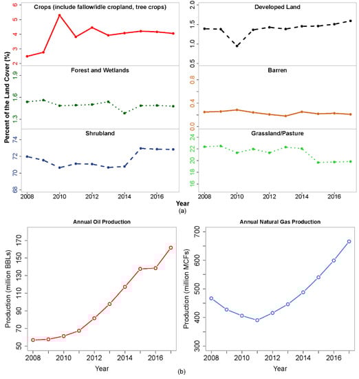 The oil & gas production data used in this study are searchable at the following web portal hosted at New Mexico Tech: http://octane.nmt.edu/gotech/Main.aspx, accessed on 8 October 2019. The CDL land cover data is downloadable at https://nassgeodata.gmu.edu/CropScape/, accessed on 8 October 2019. These data are also available from the author upon request.