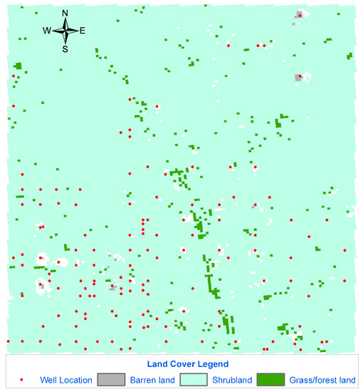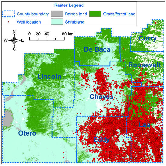 The study area covers eight counties in southeastern New Mexico that overlap with the most productive shale formation of the Permian Basin (i.e., the Delaware sub-basin and part of the Central sub-basin). Figure 2 shows the extent of the study area. The well locations suggest that the data sample mainly comes from four counties: Chaves, Roosevelt, Eddy, and Lea. Based on some estimates (e.g., [16]), the area produces over 20% of the total output in the entire Permian Basin (40–50 counties altogether). The exorbitant intensity of production in the region leads to concerns on land cover health and other environmental issues. Figure 2 also illustrates the major vegetation covers that this study investigates. The main land cover in the active production area is shrubland surrounded by grass/forest land in the east and the north. Patches of barren land exist. Agricultural lands and developed areas (likely including drilling pads and main roads) are removed from this study to focus only on the natural vegetation cover. Agricultural lands (mostly irrigated cropland) can be found on the eastern edge of the study area. Chaves County contains a large developed area (Roswell, NM, USA).