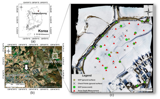 Study area: (a) Location of Daegwallyeong-Myeon; (b) Location of Automatic Weather Station (AWS) and study area; (c) Aerial photo of the study site. Yellow stars and X marks represent GCPs and check points on the ground surface, respectively. Green circles and red triangles represent GCPs and the in situ snow depth measurement location on the snow surface, respectively.