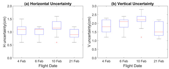 Figure 4 shows the box plot of the horizontal and vertical uncertainties calculated for each of the surveying days. Each box plot was drawn based on the coordinates of 17 GCPs. All horizontal and vertical uncertainties ranged under 1.6 cm and 2.8 cm, suggesting that the in situ GCP positioning was successful.