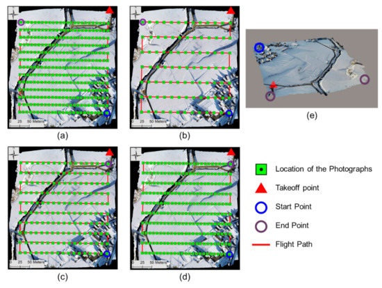 Flight path and location of photo according to each method: (a) 50 m, 80%; (b) 100 m, 80%; (c) 50 m, 70%; (d) 100 m, 90%, respectively. (e) Three-dimensional view of the study area viewed from the take-off site.