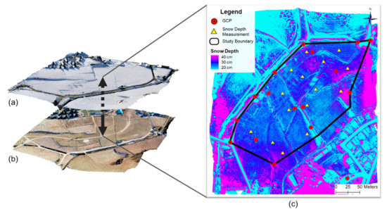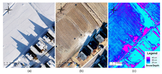 (a) Ortho+DSM of snow surface (b) Ortho+DSM of the ground surface. (c) The snow depth map that was obtained by subtracting the DSM of ground from that of the snow surface (4 February 2020, 9 a.m.).
