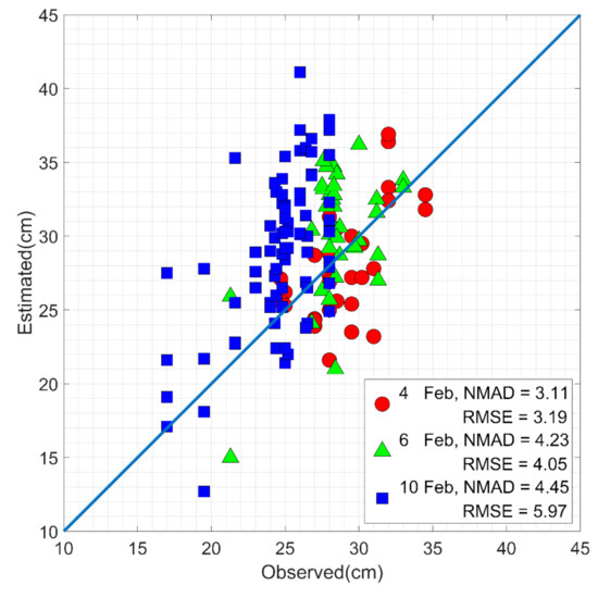 Observed (x) versus estimated snow depth from the UAV photogrammetry (y) for 4, 6, and 10 February 2020.