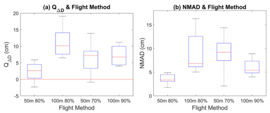 Figure 8 shows the box plots of the (a) and (b) NMAD of the estimated snow depth that varies with four different conditions of UAV flight altitudes and photograph overlap ratios. Low and NMAD is associated with low flight altitude and high photograph overlap. This is because a greater number of tie-points can be identified at low flight altitudes and high photograph overlap.