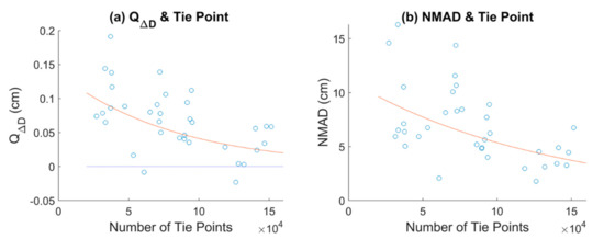 Figure 9a,b shows the and the NMAD of each survey varying with the number of identified tie points. A greater number of tie points is associated with low and low NMAD of the estimated snow depth. The vertical variation in the scatters is associated with flight time, altitude, and overlap ratio, and the number, accuracy and spatial configuration of GCPs, which we explain in the following sections.