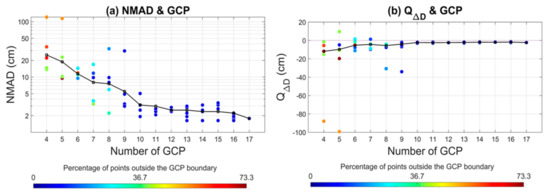 It is widely known that GCP spatial density affects the accuracy of photogrammetric surveys [55]. This study assumed that the same principle applies to the snow depth survey. To verify this hypothesis, this study repeated the process of intentionally removing the GCPs while performing the photogrammetric processing and recorded NMAD and of the estimated snow depth. Results with the lowest NMAD value (50 m height—80% overlap ratio, 4 February, 9 a.m.) were used for this experiment. Figure 10a,b show NMAD and of the estimated snow depth varying with the number of GCPs. The GCPs were removed evenly over the space so that the remaining GCPs are distributed equally over the space. The number of remaining GCPs varied between 4 and 17, which correspond to the spatial density of 0.4 GCP/km2 and 1.7 GCP/km2, respectively.
