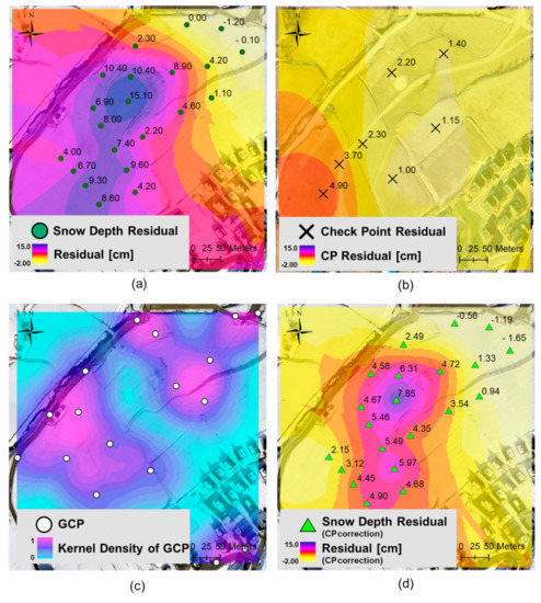The spatial configuration as well as the spatial density of GCPs is important. Figure 11c shows the kernel density of spatially distributed GCP points; the pinker the area, the more GCPs are influencing the area. Figure 11a shows an interpolated map of snow depth residual of the estimated snow depth corresponding to the measurement with the overall lowest accuracy (50 m height—80% overlap ratio, 10 February, 3 p.m.). Figure 11b shows an interpolated map of CP residual of snow-free surface DSM, which were used to obtain Figure 11d, which is the map of the snow depth residual after CP correction. Figure 11c shows the kernel density of the GCPs. It is shown that the blue area of Figure 11c (area further away from GCPs) and the purple area of Figure 11d (area with greater estimation error) coincides, suggesting that the number of GCPs used for bundle adjustment may influence the accuracy of the photogrammetry.
