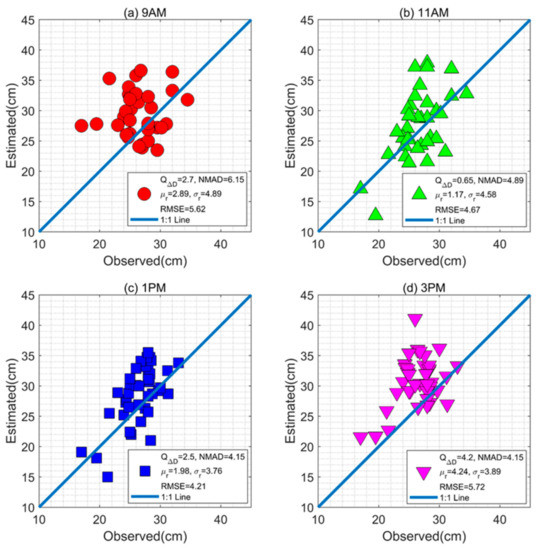 Figure 12 shows the scatter plot comparing the observed snow depth (x) and the snow depth estimated form the UAV photogrammetry (y) for the surveying time of (a) 9 a.m., (b) 11 a.m., (c) 1 p.m., and (d) 3 p.m., respectively. Results corresponding to the surveying condition of 50 m—80% for all dates (4, 6, and 10 February) are shown together in each scatter plot.