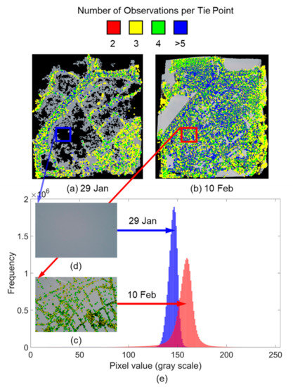 The location of the tie points that were identified by the program that were used in this study for the date of (a,c) 29 January 2020 (9 p.m.) and (b,d) 10 February 2020 (3 p.m.). (e) Gray histogram of photo taken on 29 January and 10 February at the same position, respectively. Black area in (a) and (b) represents the area where photographs could not be tied due to the lack of tie points.