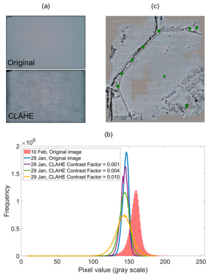 (a) Comparison original image (above) and CLAHE image (below). (b) Gray scale histogram: image of 10 February (bar) and 29 January (line) at the same position, respectively. (c) Constructed DSM using CLAHE filtered images.