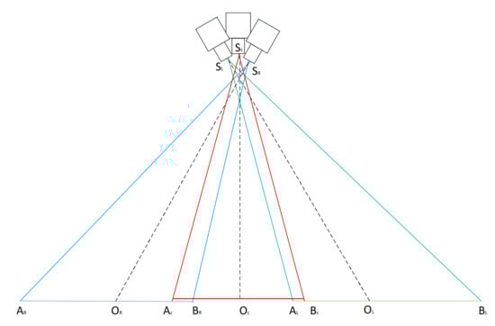 The principle of imaging is shown in Figure 1. The middle imager is perpendicular to the visual field of ACBC. The left and right imagers are tilted inwards, with the FOV on the ground of ALBL and ARBR. The total FOV of AWSHRHIS is ARBL, in which ALBC is the overlap between the middle and right images, and ACBR is the overlap between the middle and left images.