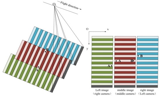 Pushbroom scanning mode is used in AWSHRHIS. With the movement of the flight platform, three image strips can be obtained respectively, with small imaging overlaps. Due to the installation alignment error, the FOV of each subsystem exposured at the same time is misaligned on the ground as shown in Figure 2. The boresight misalignments can induce inconsistence of imaging time for the same object in image overlaps. It is hard to clear off the influence of platform vibration, especially for an airborne platform with low stability, which usually induce obvious image distortion. The inconsistent imaging time of homonymy points will cause different scale and direction of distortion on images. Therefore, eliminating image distortion based on geometric imaging model is an important step to achieve seamless image stitching.