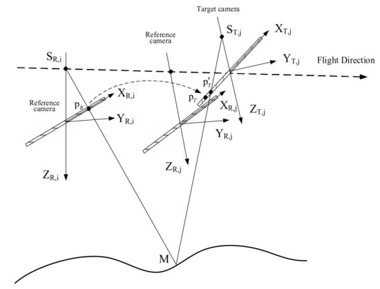 The middle imager is taken as the reference imager, and the adjacent imager as the target imager. Thus, the sensor coordinate system is parallel to the image space coordinate system of middle imager. The unknowns are the three orientation parameters (ω, φ, κ) between the target imager and the reference imager image space coordinate system. and are a pair of homonymy points (as shown in Figure 3), which are obtained by the reference imager and the target imager at the time of and , respectively. The corresponding coordinates and in the image space coordinate systems are defined by