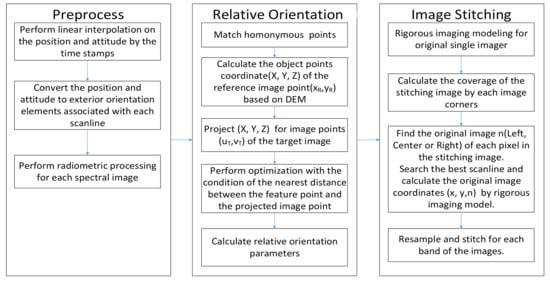As illustrated in Figure 4, the stitching method based on relative orientation and rigorous geometric model is performed via the following steps. Image radiometric and IMU/GNSS data interpolation were performed first. Then, relative orientation elements between the adjacent imagers were calculated. A rigorous imaging model was established with the relative orientation elements, and georectification was performed to reduce the image distortion which mainly caused by the unstable flight condition. Then, image resampling and stitching were performed for each band of the image.