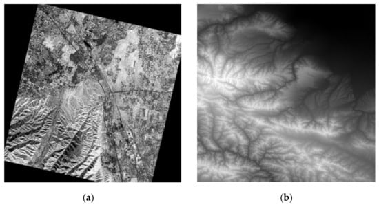 Original DOM and DEM used in simulation: (a) SuperView-1 panchromatic image; (b) ASTER DEM.
