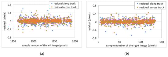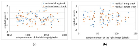 Image projection residual calculated by Equation (9) was used to evaluate the precision of relative orientation. Figure 8a shows the image projection residuals of the left- middle images after relative orientation. A total of 639 pairs of homonymy points are matched. The residual error is less than 0.8 pixels. The RMSE (root mean square error) of the residual across the track and along the track are 0.103 pixels and 0.114 pixels, respectively. Figure 8b shows the image projection residuals of the right-middle images. A total of 728 pairs of homonymy points are matched. The RMSE of the residual across the track and along the track are 0.097 pixels and 0.101 pixels, respectively.