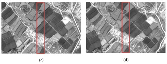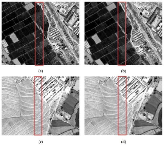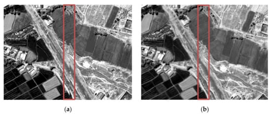 The images before and after stitching are shown as Figure 13. Figure 13a is the overlapping area of left and middle original image, and Figure 13b shows the corresponding area of stitching image. Figure 13c,d show original and stitching images at the overlapping area between right and middle images. After georectification and stitching, most of the distortion is rectified, and the offset is eliminated.